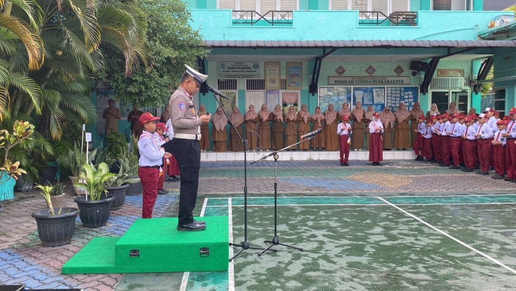 LHOKSEUMAWE – Unit Kamsel Satlantas Polres Lhokseumawe melaksanakan program Polisi Saweu Sikula sebagai pembina upacara di SD Negeri 1 Banda Sakti, Senin (18/11/2024) pagi.