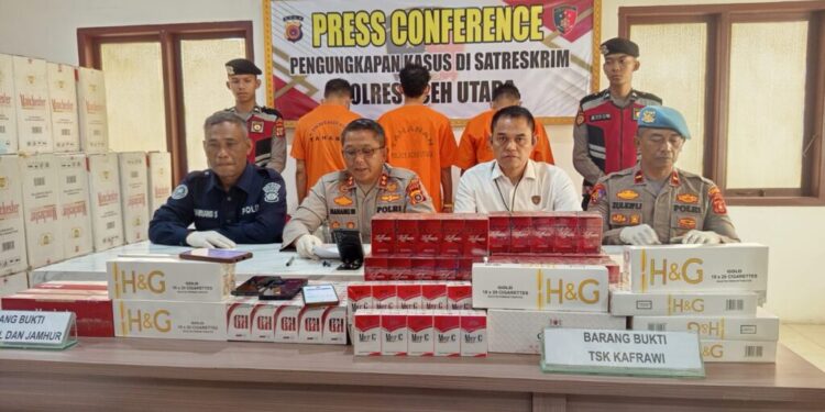ACEH UTARA – Polres Aceh Utara berhasil mengungkap kasus peredaran rokok ilegal tanpa peringatan kesehatan, dengan mengamankan tiga tersangka utama dalam operasi yang berlangsung di dua kecamatan berbeda di Aceh Utara.