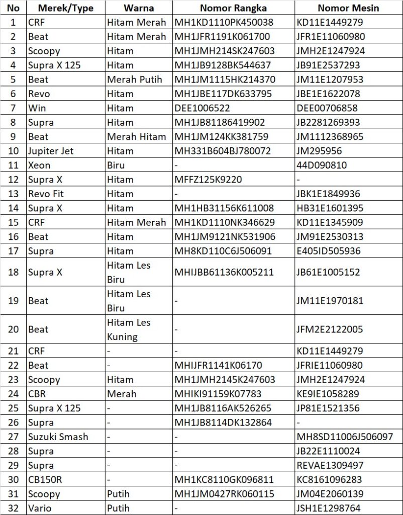 Berikut daftar 32 unit sepeda motor hasil sitaan Polres Aceh Utara (tanda “-” berarti data tidak tersedia atau belum terkonfirmasi):