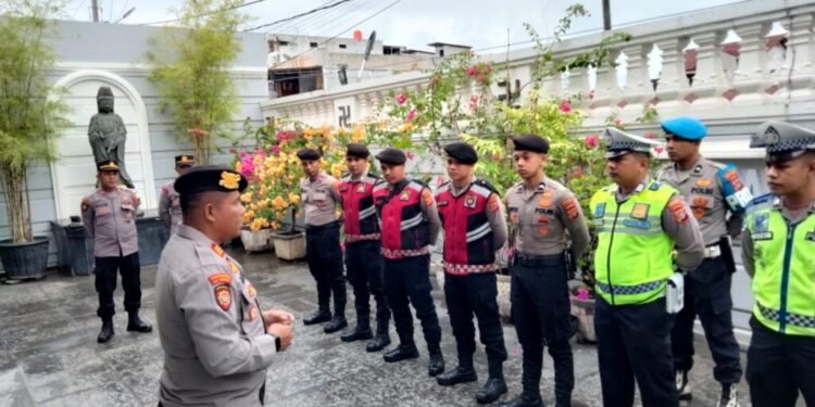 Lhokseumawe – Personel Polres Lhokseumawe melaksanakan pengamanan kegiatan Ibadah Tahun Baru Imlek 2026/2577 Kongzili di Vihara Budha Tirta Lhokseumawe, Jalan Cut Mutia, Desa Pusong Lama, Kecamatan Banda Sakti, Kota Lhokseumawe, Selasa (17/2/2026).