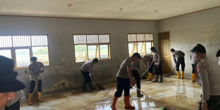 Lhokseumawe — Personel Polres Lhokseumawe bersama BKO Brimob dan Polsek Dewantara melaksanakan kegiatan pembersihan lumpur pascabanjir di SMP Negeri 2 Dewantara, Desa Glumpang Sulu Barat, Kecamatan Dewantara, Kabupaten Aceh Utara, Selasa (30/12/2025).
