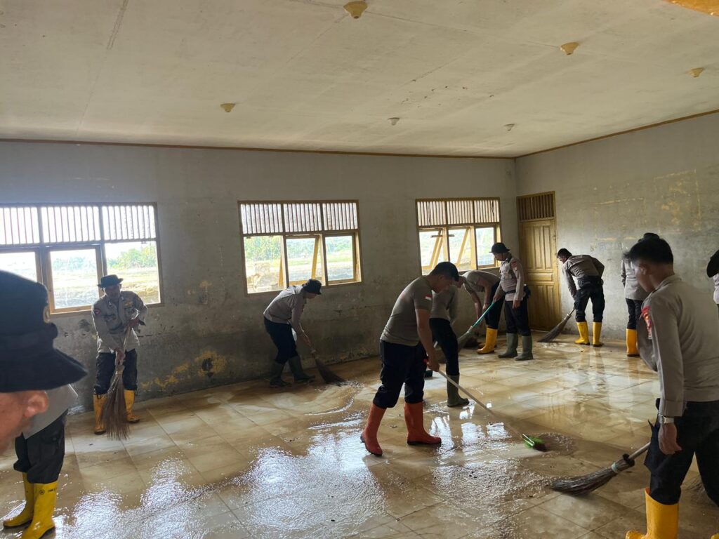 Lhokseumawe — Personel Polres Lhokseumawe bersama BKO Brimob dan Polsek Dewantara melaksanakan kegiatan pembersihan lumpur pascabanjir di SMP Negeri 2 Dewantara, Desa Glumpang Sulu Barat, Kecamatan Dewantara, Kabupaten Aceh Utara, Selasa (30/12/2025).