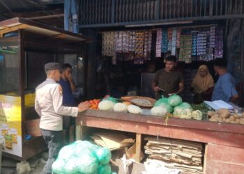 ACEH UTARA - Personel Polsek Syamtalira Bayu, Polres Lhokseumawe, melaksanakan patroli dialogis di Pasar Keude Bayu, Kecamatan Syamtalira Bayu, Kabupaten...