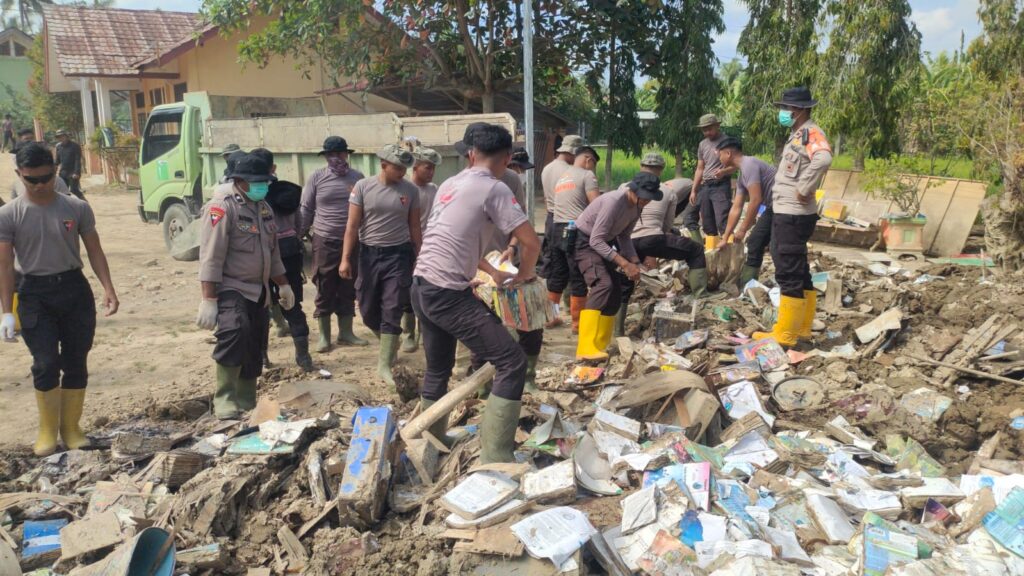 LHOKSEUMAWE – Personel Polres Lhokseumawe bersama BKO Brimobda Polda Kalimantan Timur melaksanakan kegiatan pembersihan lanjutan di SD Negeri 3 Sawang, Desa Gampong Teungoh, Kecamatan Sawang, Kabupaten Aceh Utara, Selasa (3/2/2026).
