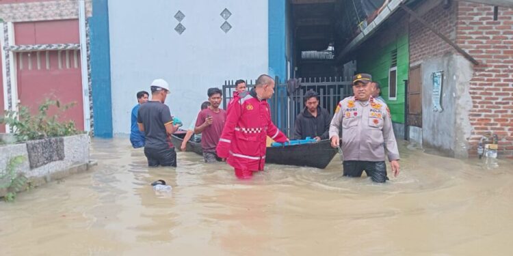 LHOKSEUMAWE – Hujan deras yang terus mengguyur wilayah Kota Lhokseumawe sejak dini hari kembali memicu banjir di sejumlah pemukiman. Menyikapi situasi tersebut, personel Polres Lhokseumawe bergerak cepat mengevakuasi warga yang terdampak banjir di Desa Batuphat Barat, Kecamatan Muara Satu, Kota Lhokseumawe, kamis siang (27/11/2025).