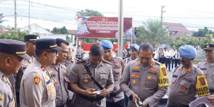 LHOKSEUMAWE – Polres Lhokseumawe menggelar apel pemeriksaan senjata api (senpi) dan amunisi personel di Lapangan Apel Mapolres Lhokseumawe, Senin (23/12/2024) pagi.