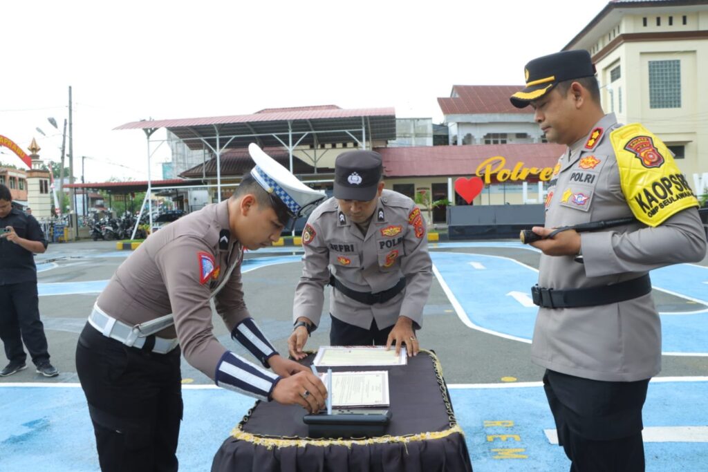 Dalam acara apel tersebut, tampak tiga personil perwakilan yang ditunjuk melakukan penandatanganan pakta integritas tidak terlibat dalam perjudian dalam segala bentuk perjudian dihadapan Kapolres Lhokseumawe.