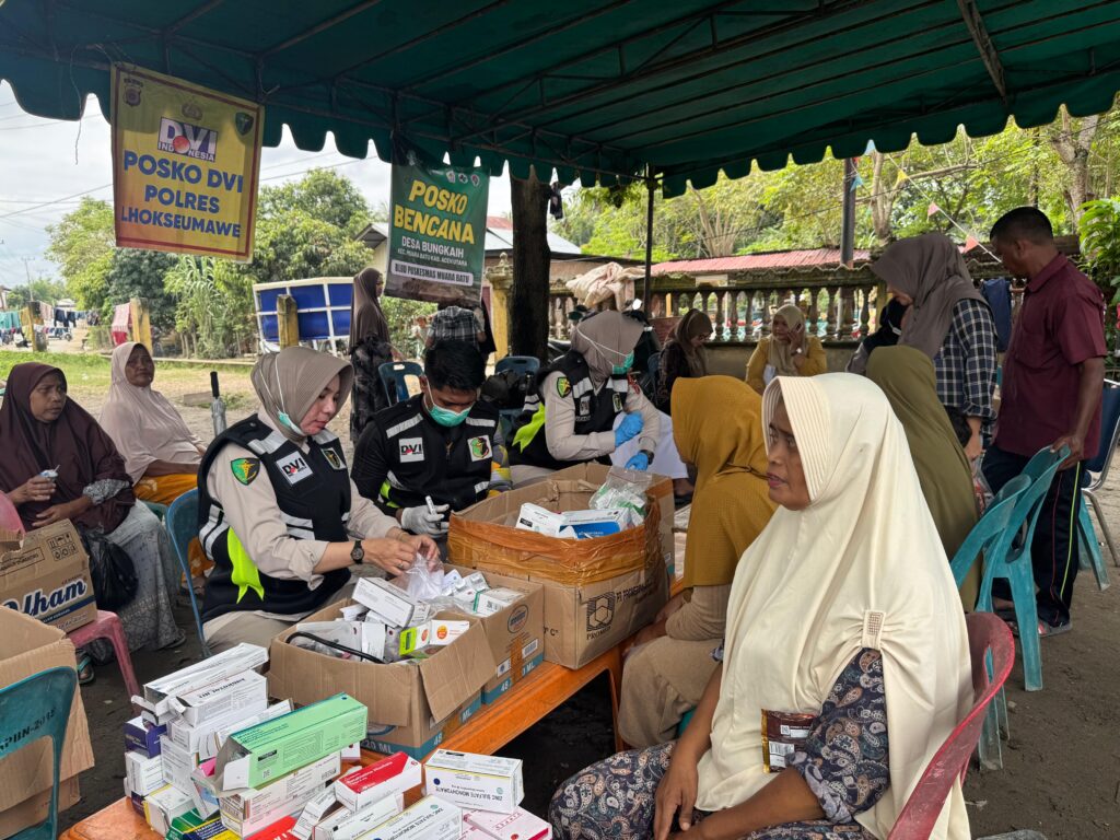 Aceh Utara – Polres Lhokseumawe melalui Seksi Kedokteran dan Kesehatan (Sidokkes) melaksanakan kegiatan bakti kesehatan (baktikes) bagi masyarakat yang mengungsi akibat banjir, Kamis (18/12/2025). Kegiatan tersebut berlangsung di Posko Pengungsian Desa Keude Bungkaih, Kecamatan Muara Batu, Kabupaten Aceh Utara.
