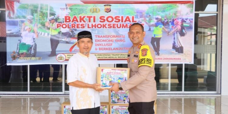 LHOKSEUMAWE | Polres Lhokseumawe menggelar Bakti sosial pembagian sembako serentak kepada masyarakat dalam rangka HUT Bhayangkara ke 78 tahun 2024 di halaman Mesjid Babul Taqwa Polres Lhokseumawe, Selasa (25/6/2024) pagi.
