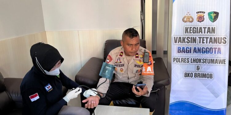 LHOKSEUEMAWE – Polres Lhokseumawe melaksanakan kegiatan Bhakti Kesehatan (Baktikes) berupa pemberian vaksin tetanus dan pembagian vitamin kepada personel BKO Brimob serta personel Polres Lhokseumawe, Selasa (27/1/2026). Kegiatan tersebut berlangsung di Polres Lhokseumawe mulai pukul 08.00 WIB hingga selesai.