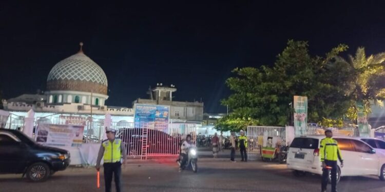 Lhokseumawe – Personel Sat Lantas Polres Lhokseumawe menggelar kegiatan pengaturan lalu lintas dan Blue Light Patrol menjelang salat tarawih di Masjid Jamik, Desa Lancang Garam, Kecamatan Banda Sakti, Kota Lhokseumawe, pada Selasa (25/3/2025) malam.