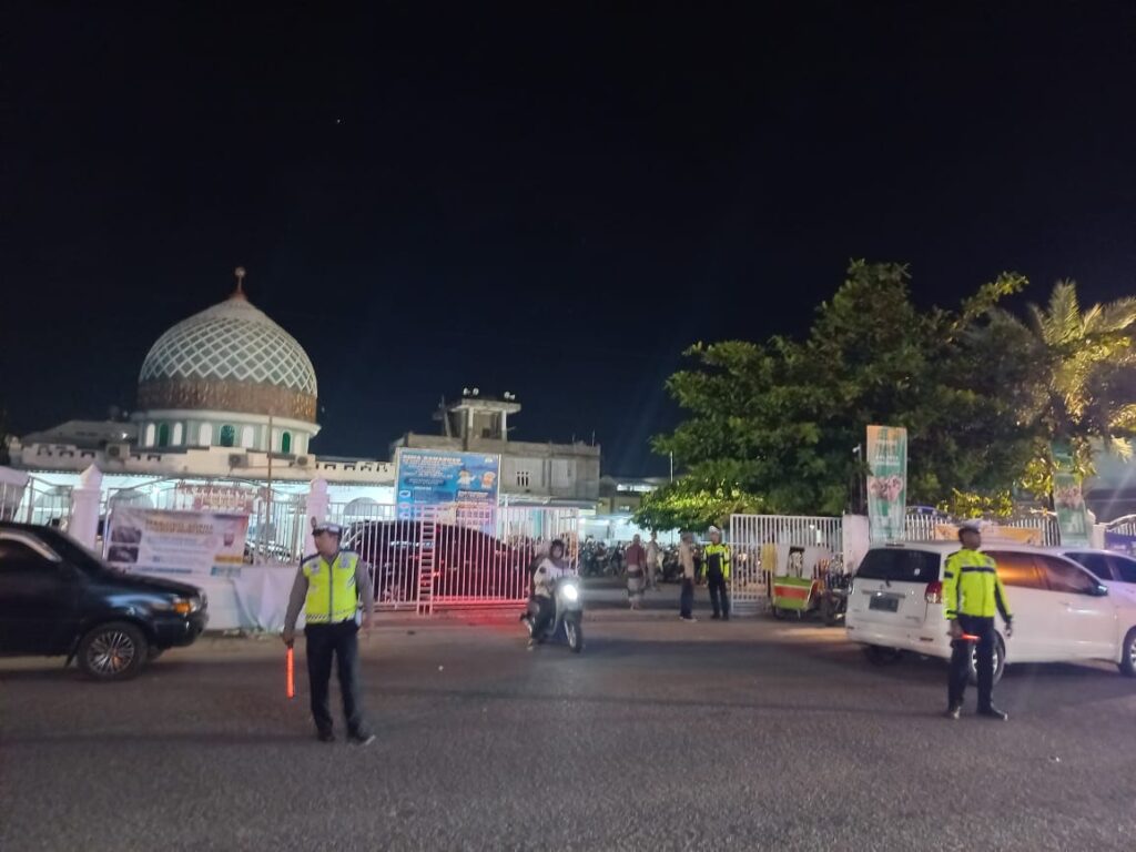 Lhokseumawe – Personel Sat Lantas Polres Lhokseumawe menggelar kegiatan pengaturan lalu lintas dan Blue Light Patrol menjelang salat tarawih di Masjid Jamik, Desa Lancang Garam, Kecamatan Banda Sakti, Kota Lhokseumawe, pada Selasa (25/3/2025) malam.
