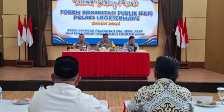 Lhokseumawe – Polres Lhokseumawe menggelar Forum Konsultasi Publik (FKP) Tahun 2026 di Gedung Serbaguna Wira Satya Mapolres Lhokseumawe, Jumat (13/2/2026) pagi. Kegiatan ini menjadi wadah dialog terbuka antara Polri dan masyarakat dalam rangka meningkatkan kualitas pelayanan publik di wilayah hukum Polres Lhokseumawe.