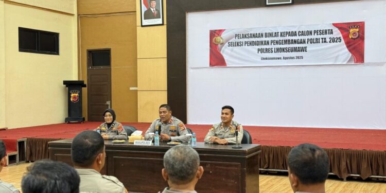 Lhokseumawe – Polres Lhokseumawe menggelar kegiatan pembinaan, pelatihan, dan pemeriksaan kesehatan bagi calon peserta Pendidikan Alih Golongan (PAG) Tahun Anggaran 2025. Kegiatan tersebut berlangsung di Aula Serbaguna Wira Satya Polres Lhokseumawe, Senin (11/8/2025) pagi.