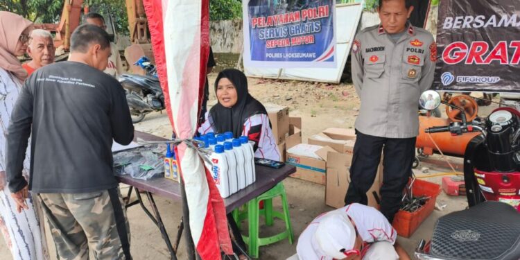 Aceh Utara — Dalam rangka meningkatkan pelayanan serta mempererat hubungan antara Polri dan masyarakat, Sat Binmas Polres Lhokseumawe bekerja sama dengan Dealer Honda UD. Prima Nusantara melaksanakan kegiatan servis motor keliling dan cuci motor gratis bagi masyarakat terdampak banjir, Selasa (23/12/2025).