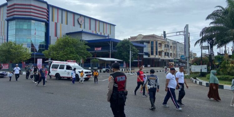 LHOKSEUMAWE – Polres Lhokseumawe melakukan pengamanan pada kegiatan jalan sehat dalam rangka HUT ke 25 Kementerian BUMN di Kota Lhokseumawe, Minggu (19/2/2023) pagi.