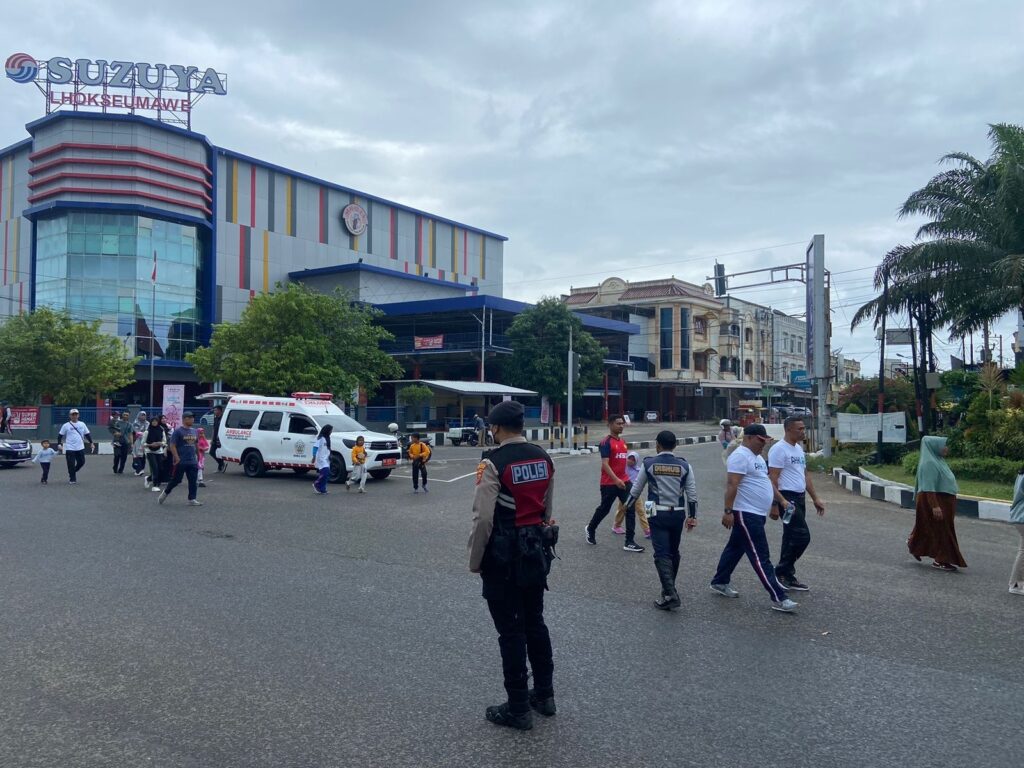 LHOKSEUMAWE – Polres Lhokseumawe melakukan pengamanan pada kegiatan jalan sehat dalam rangka HUT ke 25 Kementerian BUMN di Kota Lhokseumawe, Minggu (19/2/2023) pagi.