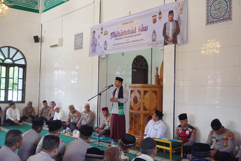 LHOKSEUMAWE – Dalam rangka memperingati Maulid Nabi Muhammad SAW 1447 H/2025, Polres Lhokseumawe menggelar acara keagamaan di Masjid Babuttaqwa, Jumat (5/9/2025) pagi. Peringatan yang mengangkat tema “Dengan Meneladani Akhlak Rasulullah SAW Kita Wujudkan Polri Presisi Guna Mendukung Asta Cita” ini berlangsung khidmat.