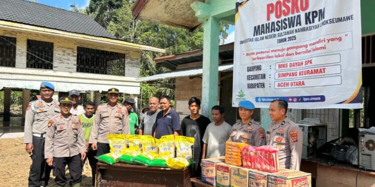 Aceh Utara – Polres Lhokseumawe kembali menunjukkan kepedulian terhadap warga terdampak banjir dengan menyalurkan bantuan sosial ke Posko Pengungsian Desa Meunasah Dayah, Kecamatan Simpang Keramat, Minggu (30/11/2025) sekitar pukul 08.30 WIB.