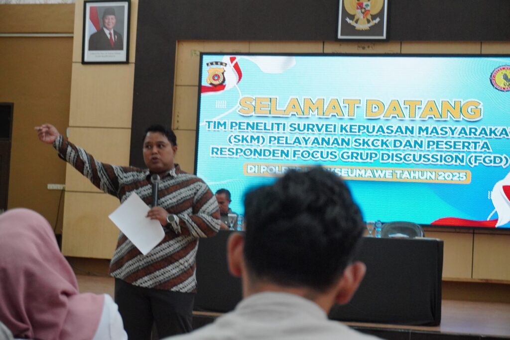 Lhokseumawe — Polres Lhokseumawe menerima kunjungan Tim Peneliti Survei Kepuasan Masyarakat (SKM) Tahun Anggaran 2025 yang menilai kualitas pelayanan Surat Keterangan Catatan Kepolisian (SKCK). Kegiatan ini dirangkai dengan Focus Group Discussion (FGD) bersama para responden dan berlangsung di Aula Gedung Serbaguna Polres Lhokseumawe, Selasa (11/11/2025).