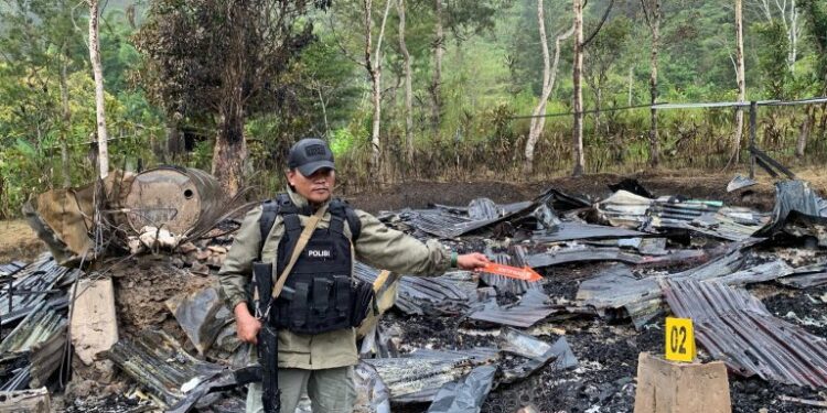 Yahukimo — Personel Satgas Gakkum Operasi Damai Cartenz 2025 melakukan kegiatan evakuasi dan olah tempat kejadian perkara (TKP) atas insiden penyerangan terhadap guru honorer dan tenaga kesehatan serta pembakaran fasilitas publik di Distrik Anggruk, Kabupaten Yahukimo, Senin (24/3).