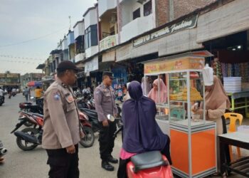 LHOKSEUMAWE - Personel Polsek Syamtalira Bayu melakukan pengamanan di lokasi penjualan takjil jelang waktu berbuka puasa di titik penggal...