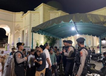 LHOKSEUMAWE - Tim Unit Reaksi Cepat (URC) Polres Lhokseumawe melakukan pengamanan shalat tarawih di Masjid Islamic Center Lhokseumawe, Jumat (7/4/2023)...