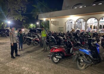 LHOKSEUMAWE - Personel Polsek Muara Batu melakukan pengamanan shalat tarawih dan menjaga kendaraan jemaah di Masjid Jamik Al Izzah,...