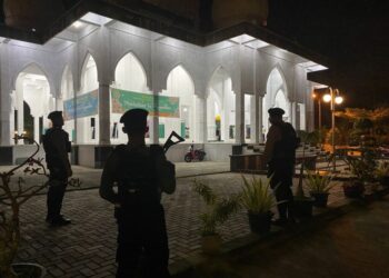 LHOKSEUMAWE - Tim Unit Reaksi Cepat (URC) Sat Samapta Polres Lhokseumawe siaga di masjid guna melakukan pengamanan shalat Isya...