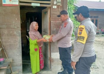 LHOKSEUMAWE - Kapolsek Sawang, Iptu Ade Candra, SH bersama personel membagikan 40 nasi kotak kepada anak yatim dan warga...