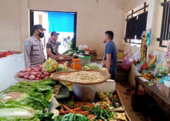 LHOKSEUMAWE - Personel Polsek Nisam kembali monitoring stok sembako ke sejumlah pedagang di pasar tradisional dan toko kelontong di Keude...