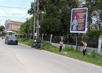 LHOKSEUMAWE - Cegah kenakalan remaja, personel Polsek Nisam menempelkan himbauan dari Kapolres Lhokseumawe di tempat publik di Kecamatan Nisam,...