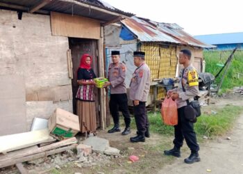 LHOKSEUMAWE - Personel Polsek Banda Sakti membagikan puluhan nasi kotak kepada warga kurang mampu jelang waktu berbuka puasa di...