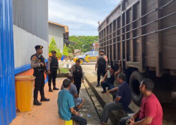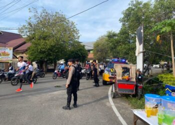 LHOKSEUMAWE - Personel Polsek Kuta Makmur turun ke pasar Keude Bereughang, Kecamatan Kuta Makmur, Aceh Utara, wilayah hukum Polres...