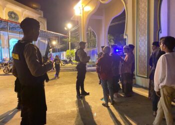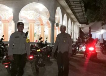 LHOKSEUMAWE - Personel Polsek Nisam melaksanakan pengamanan pelaksanaan ibadah shalat tarawih di Masjid Al Aqsa Gampong Meunasah Meucat, Kecamatan...