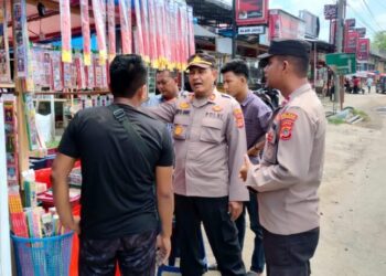 LHOKSEUMAWE - Personel Polsek Blang Mangat melakukan patroli ke sejumlah pedagang kembang api di Keude Punteut, Kecamatan Blang Mangat,...