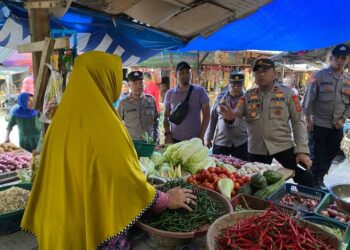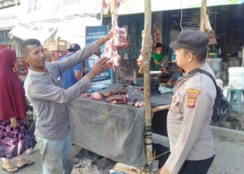 LHOKSEUMAWE - Kapolsek Muara Dua, Ipda Roni, SH turun langsung ke pasar mengecek stok sembako dan harga daging meugang...