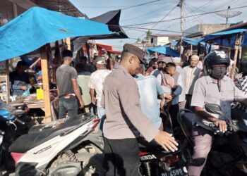 LHOKSEUMAWE - Patroli di pasar pada hari meugang, personel Polsek Syamtalira Bayu, Polres Lhokseumawe mengimbau masyarakat agar tetap menjaga...