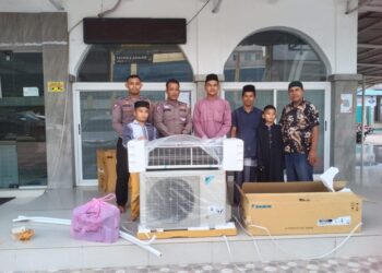 LHOKSEUMAWE - Polantas Lhokseumawe menyerahkan bantuan satu unit pendingin ruangan atau AC kepada pengurus Masjid Jamik, Lancang Garam, Kecamatan...