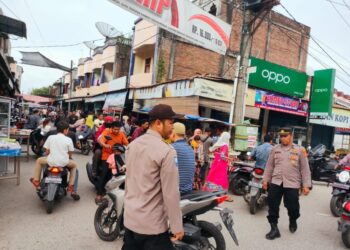 LHOKSEUMAWE - Polsek Syamtalira Bayu melakukan pengamanan dan pengaturan lalu lintas di kawasan Keude Bayu, Syamtalira Bayu, Aceh Utara,...