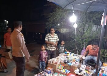 LHOKSEUMAWE - Personel Polsek Samudera menyambagi pedagang kelontong di kawasan Keude Geudong, Kecamatan Samudera, Aceh Utara, wilayah hukum Polres...
