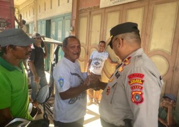 LHOKSEUMAWE - Kapolsek Muara Dua, Ipda Roni, SH menyambagi buruh bongkar muat di Desa Meunasah Mee, Kecamatan Muara Dua,...