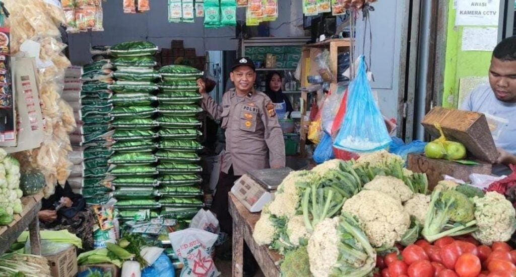 LHOKSEUMAWE - Personel Polsek Simpang Keuramat mengecek ketersediaan beras di pasar Keude Simpang Empat, Simpang Keuramat, Aceh Utara, wilayah hukum...