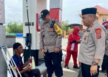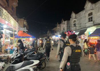 LHOKSEUMAWE - Dua Personel Polsek Syamtalira Bayu melaksanakan patroli di pusat penjualan takjil di kawasan Keude Bayu, Aceh Utara, wilayah...