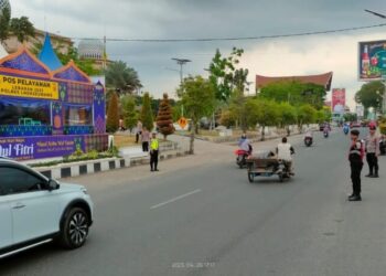 LHOKSEUMAWE - Polantas Lhokseumawe mengatur arus lalu lintas di depan pos pelayanan Ops Ketupat Seulawah 2023 Banda Sakti, Kota...