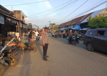 LHOKSEUMAWE - Polsek Kuta Makmur siaga di titik rawan macet di kawasan Keude Blang Ara, Kecamatan Kuta Makmur, Aceh Utara,...