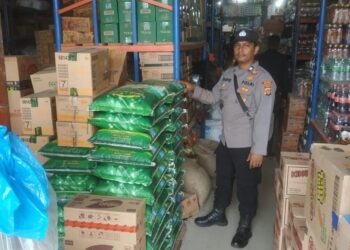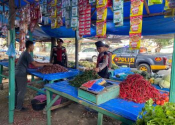 LHOKSEUMAWE - Dua personel Polsek Muara Batu mengecek stabilitas sembako menjelang lebaran Idul Fitri 1444 Hijriah di pasar Inpres...