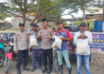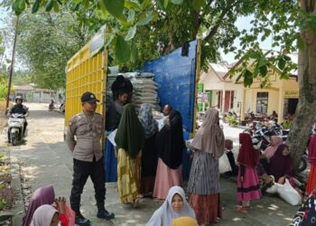 LHOKSEUMAWE - Personel Polsek Sawang melakukan pengamanan penyaluran bantuan pangan Beras Cadangan Pemerintah (BCP) tahap I tahun 2023 di...