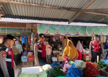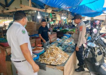 LHOKSEUMAWE - Personel Polsek Syamtalira Bayu melakukan pengecekan stok sembako di pasar tradisional Keude Bayu, Kecamatan Syamtalira Bayu, Aceh Utara,...