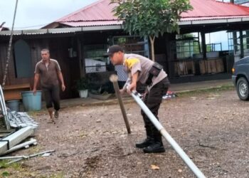 LHOKSEUMAWE - Personel Polsek Blang Mangat mengawal proses penyaluran bantuan bahan pangan atau sembako kepada warga miskin di Gampong Blang...